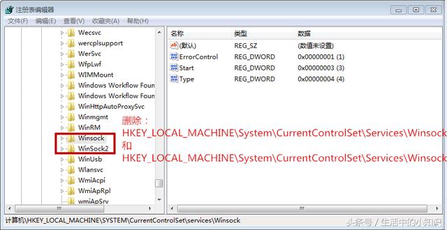 03 在弹出的对话框中,删除掉HKEY_LOCAL_MACHINESystemCurrentControlSetServicesWinsock,HKEY_LOCAL_MACHINESystemCurrentControlSetServicesWinsock2两个文件,如图示。