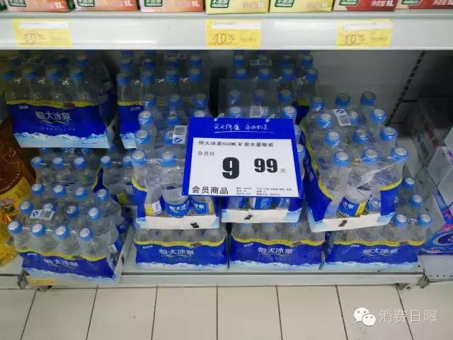 每一瓶500毫升,每瓶不到1元,比康师傅饮用水还便宜。 由于离家也就500米,笔者先下手为强,迅速搬了三箱放入购物车。为何选择恒大冰泉,作为饮用水,矿泉水肯定好于纯净水,而且恒大冰泉来自长白山的优质水源,这样的价格买到这样的矿泉水,绝对物超所值。 买到这个便宜的矿泉水,唯一的要求是会员。要知道,物美办会员卡很容易,周围的居民都会办会员卡。而且节日期间,要不要会员卡价格一个样。 细心的读者可能还会记得,前不久,笔者写一篇《(独家)恒大冰泉遭遇特大促销 一箱12瓶竟然只卖10元》的稿子,当时的日期是,9月2日。当时笔者也是到物美购买日常生活用品,发现恒大冰泉促销,10元一箱,随手购买3箱。 而这次的价格比上次便宜1分钱,经济形势不好,一分钱也是钱。 笔者特地又去了永辉超市一探究竟。 在永辉超市饮用水区域,多家企业的饮用水也都在促销中,笔者看到,恒大冰泉500ml与350ml的瓶装矿水一包价格在23.9元,折合人民币每瓶2元。促销力度不是太吸引人。