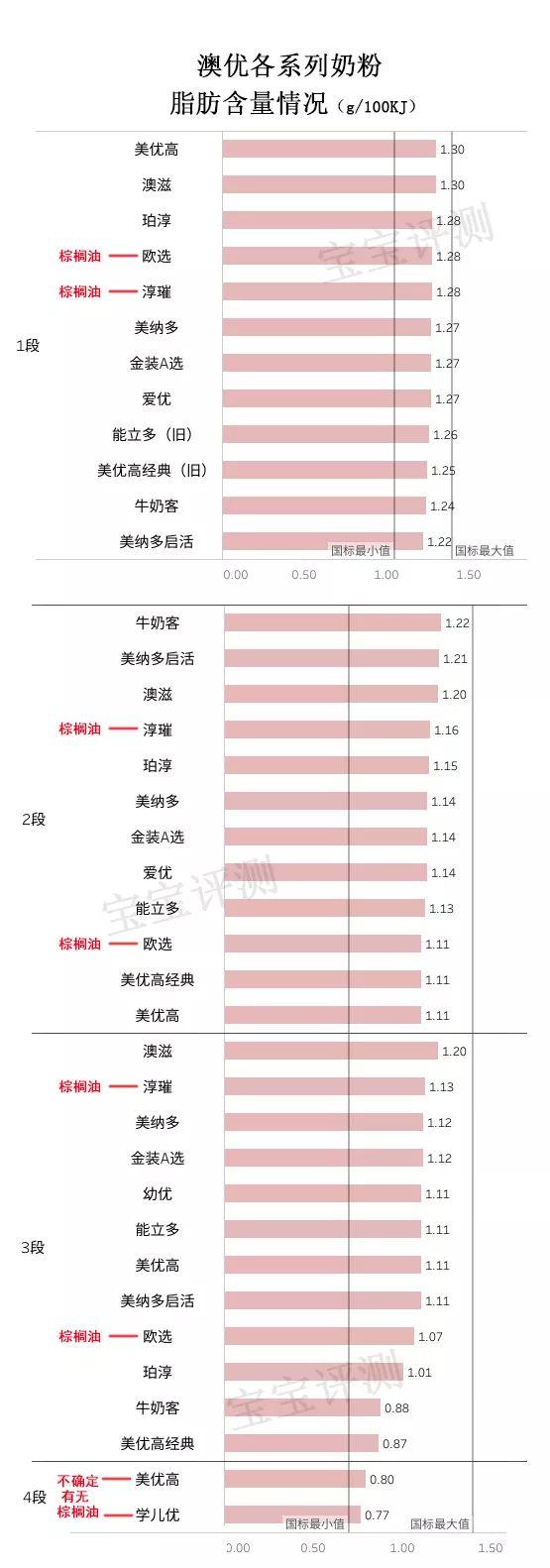 ↑ 点击查看大图 小结: ①澳优各系列1段的碳水化合物含量均符合中国国标,2段及以上均符合新国标征求意见稿的参考范围。 ②欧选全段添加了葡萄糖浆固体,除了提供热量外,没多少营养价值,属于扣分项。 其他系列都没有添加葡萄糖聚合物(麦芽糊精、葡萄糖浆固体、淀粉、白砂糖等),乳糖含量较高,保留了更多的营养价值。 脂肪