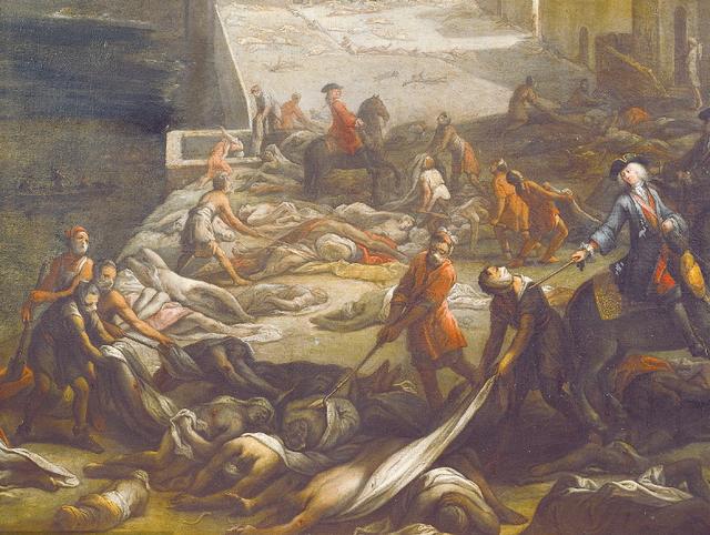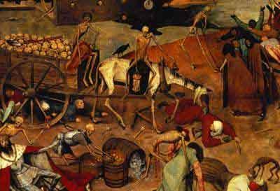 欧洲爆发瘟疫的场景 凡是得此病的人,皮肤会出现许多黑斑,进而全身虚脱,神志不清,高烧不退,最后在痛苦中死去,所以这种特殊的疾病被欧洲人叫做“黑死病”。“黑死病”在14世纪30年代发源于印度北部德里附近,后流行于南亚,1347年末传递到君士坦丁堡和克里木地区的卡发城。鞑靼蒙古军队为了吓跑意大利商人,将患者尸体抛掷于卡发城外,意大利商人将病菌带回欧洲,首先在威尼斯、热那亚、意大利北部和法国南部马赛一带流行。1348年传遍西班牙和法国,同年秋给英国以毁灭性打击。1349年侵入斯堪的纳维亚半岛和德意志,继而向东蔓延到俄罗斯。至1350年,欧洲居民有四分之一死于此疫。