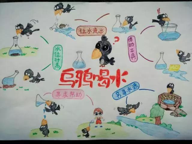 “可以找只碗把水倒出来……” “可以找伙伴帮忙……” “可以用石子把瓶子打破……” “可以用尖尖的嘴巴把瓶子啄出一个洞……” “可以把瓶子侧卧……” “可以找小朋友,用一根小水枪,把水吸起来,然后再喷到乌鸦嘴里……” 最后我们还把“乌鸦喝水”画成思维导图。