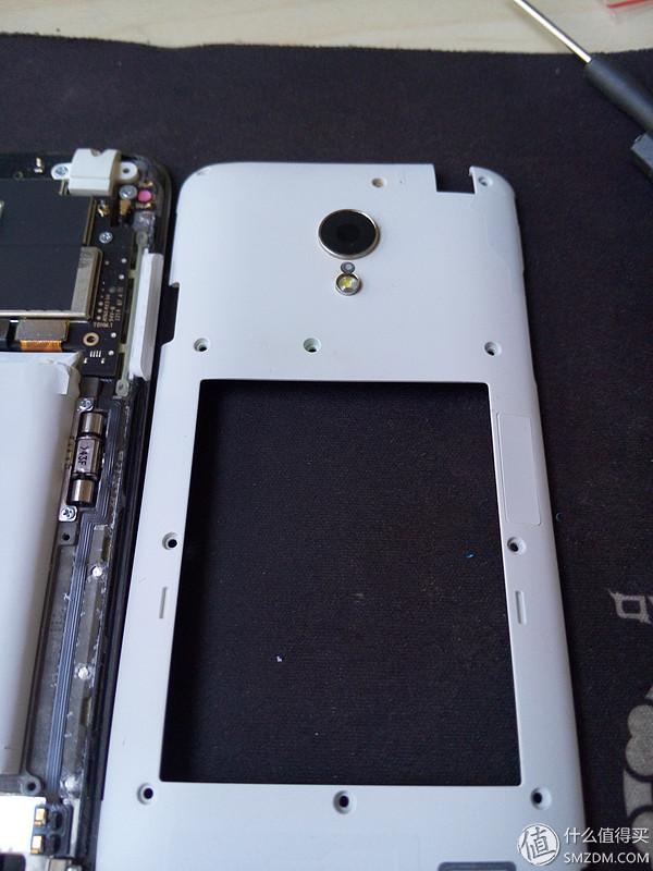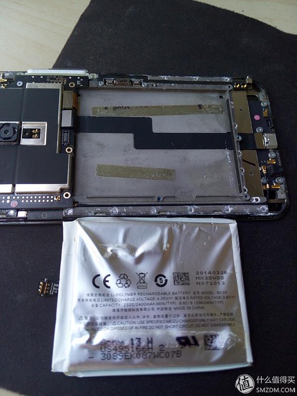 大家看到了吧,MX3电池使用双面胶粘在上面的机身框架结构上。从左边的一个小卡口下手,可以想办法把电池整个撬下来,为了减轻撬动对机身的伤害,我用电吹风稍稍对电池两边进行了加热。微微用力就下来了。 拆下来怎么看怎么像套套 剩下就是放入猫家的新电池,搭上电池排线触点,试了试,完美开机。