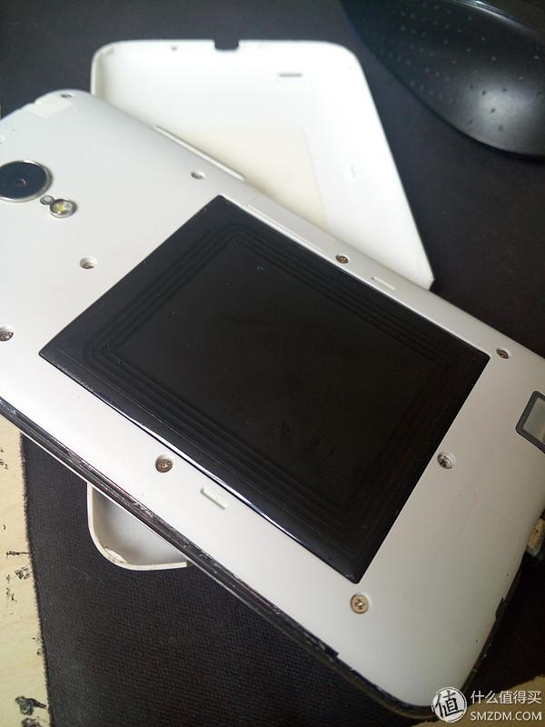 露出了电池真容和电池排线触点(红六角圈)。蓝圈就是NFC,但没有连接器触点,所以我买的电池上多出的NFC连线就剪掉了,用胶水粘在了电池边上。