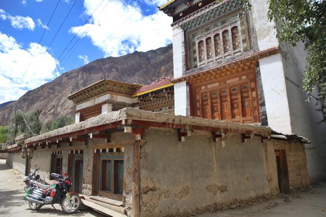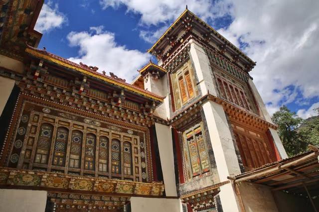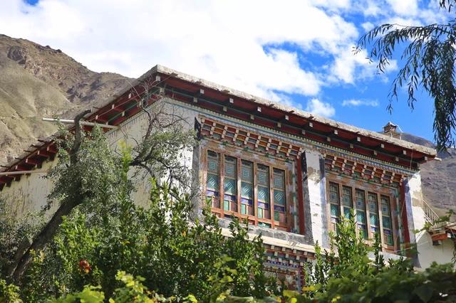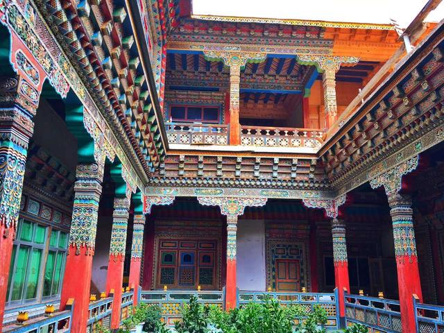 最值得一提的是,建筑内外的墙体绘画装饰以及窗框的装饰雕刻,墙体绘画装饰多种多样,有来自西域的波斯图案,也有明清风格的纹样图案,有汉式风格精致的木雕窗户,也有尼泊尔木窗窗框的木雕造型,雕刻非常精细,花纹精美。还能看到仙鹤、花鸟、金蟾等动物的雕刻。三楼是佛堂和经堂,一般人是不让进去的,就连自己家的孩子也很少让进去。了解之后才知道修建这样的一栋房屋需要耗时十多年,花费数百万才能完成。