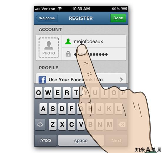 输入你的电子邮箱地址和姓名。为了方便起见,你可以轻按“使用 Facebook 信息(Use Your Facebook Info)”按钮,这将使得你的 Instagram账户和 Facebook 账户绑定。Instagram 可以导入你的 Facebook 姓名和电子邮件,并将 Facebook 用户图像作为 Instagram 的用户图像。