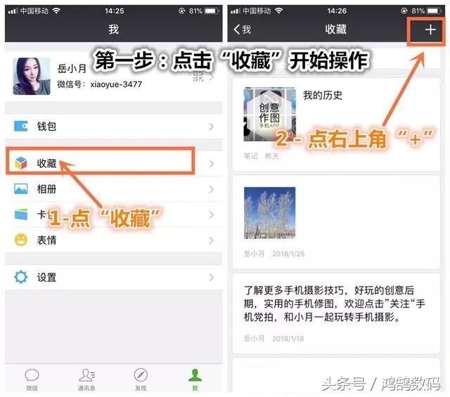 第一步:首先在手机中打开微信,然后在“我的”界面中,点击“收藏”,之后再点击右上角“+”号,如下图所示。