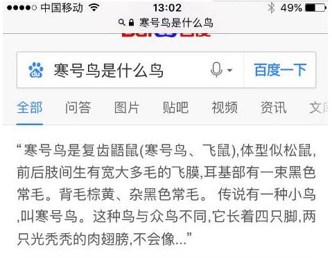 看到爆料贴之后,小编也马上查了一下资料,没想到是真的! 科普时间 寒号鸟,其实就是复齿鼯鼠。也叫橙足鼯鼠、黄足鼯鼠、飞鼠、寒号虫、寒搭拉虫,是啮齿类动物。