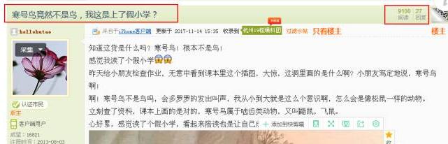 不少网友看到爆料之后,连连惊叹,称自己这么多年以来一直以为是寒号鸟不应该是只鸟吗…… 网友热评: @唐尼美:从未见过,只知道有这个故事!谢谢楼主 @1959813508:我滴娘啊,看完好担心自己的小学文凭日后不被承认呀 @zz的家:看来这么多年书都是白读了 @doue:啊啊啊?我的知识也浅薄,被科普了 @明日讃歌:从小学到现在,一直以为寒号鸟是鸟,认了二十几年的鸟突然变鼠了 @chinasky123:三十多年一直认为是鸟。。。 @sandyshen11:涨知识了,真是活到老学到老 其实,在网上随便搜了搜,有很多网友表示自己被骗了大半生!