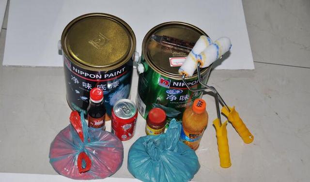 这期的实验内容是和立邦墙漆有关的。首先我们先来看一下这次实验的主要材料:由立邦漆专卖店提供的正品立邦净味底漆及荷净净味全效面漆,地上两个塑料袋子里的分别是从某商店买来的”进口立邦漆“,也就是我们俗称的”山寨“立邦。 有小孩的家庭都知道,小朋友最喜欢拿到有颜色的东西就到墙上去写写画画,一不小心酱油、饮料什么的也都有可能往墙上抹,所以我们第一站的实验是用可口可乐、海天酱油、天等辣椒酱、果粒橙来测试真伪立邦漆的防水、防污性能。