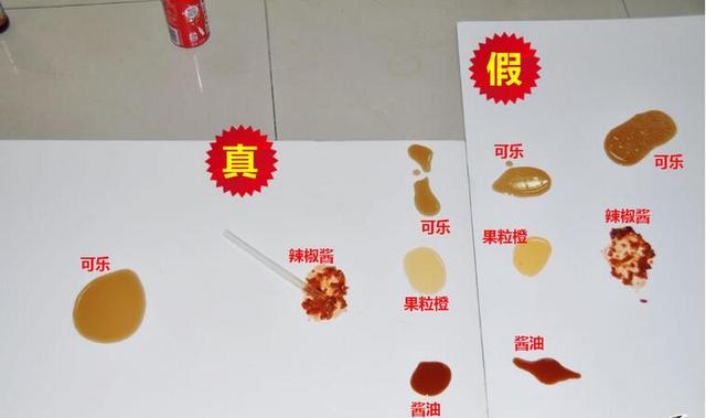 实验内容进一步升级:我们现在把可乐、辣椒酱、果粒橙、酱油分别倒在刷有正品立邦漆和山寨立邦漆的埃特板上,静等24小时之后看看刷有山寨立邦漆和正品立邦漆会出现什么样的反应。