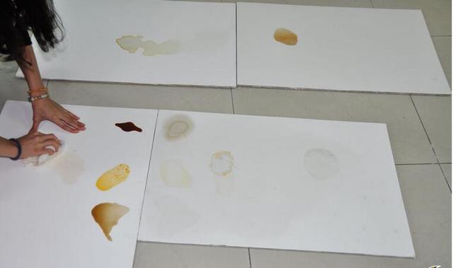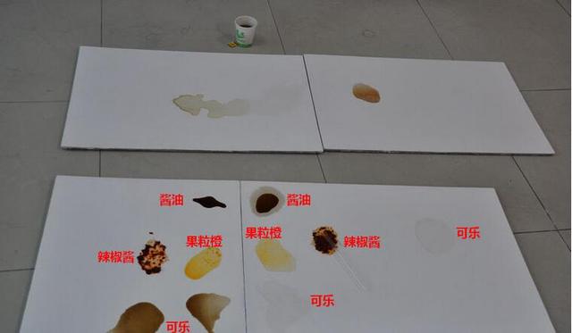 用占有少水的湿抹布分别将2块埃特板上的污渍(可乐、果粒橙、辣椒酱、酱油)分别进行擦拭,最终的结果到底如何?敬请期待!、