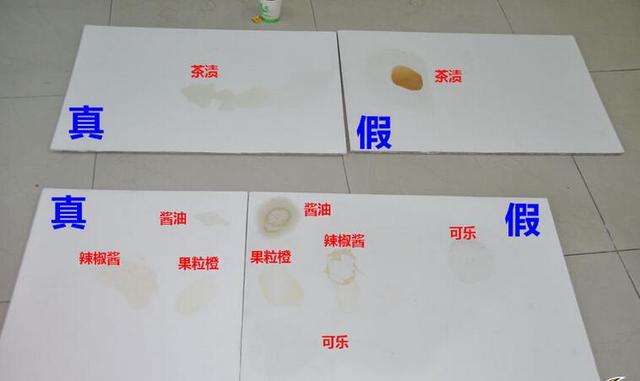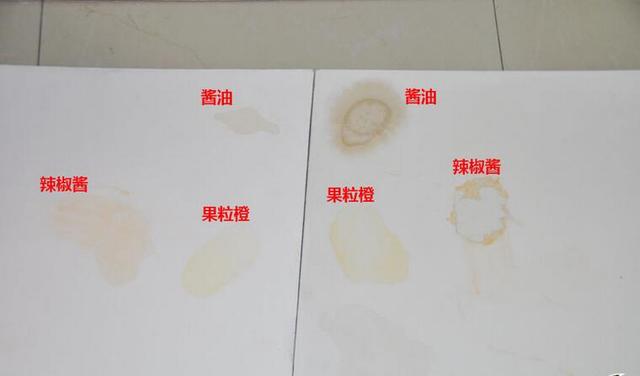 这是已经经过擦拭的对比图,左下角的正品立邦漆上的可乐痕迹已经被擦拭干净,一点痕迹都没有,而右下角的山寨立邦漆上的可乐还留有淡淡的水渍。反差最大的还是酱油和辣椒酱,正品立邦漆埃特板上的酱油被擦拭只剩下淡淡的痕迹;山寨立邦漆埃特板上的酱油痕迹不仅很黑,还明显有扩大的水印!