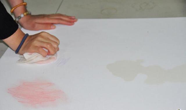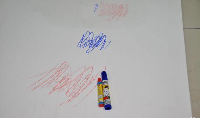 最最吃惊的是原先涂有辣椒酱的假埃特板上,直接用肉眼看似乎漆面已经整块剥落,当小编用手去触摸时更是肯定了这个答案:整块漆面已经完全剥落了。刷有假立邦漆的埃特板上倒有酱油的位置开始明显泛出小黑斑,看了让人起鸡皮疙瘩。 小孩都喜欢涂鸦,喜欢用各种颜色去发挥自己的想象力,特别是低领儿童,总喜欢在大人一个不留神的时候随手抓一个能涂鸦的东西便开始在墙上作画。接下来就用宝宝平时使用的蜡笔和水彩笔来做一下实验。