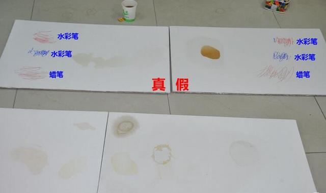 用水彩笔和蜡笔分别在刷有正品立邦漆的埃特板和山寨立邦漆的埃特板上进行水手涂鸦。