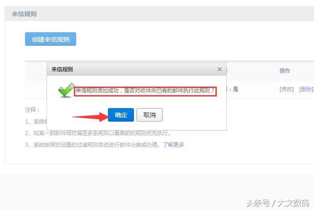 创建好来信规则后,会提示是否对收件夹已有邮件执行此规则,这里进行 确定,