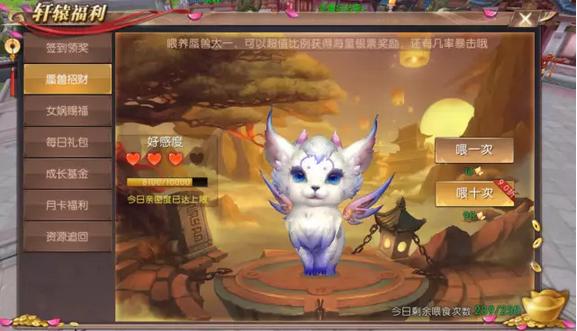 最后就是神兽太一,点开福利的“蜃兽招财”即可获取大量金票。而且每天能够进行抚摸,这样能够提高太一的好感度,从而提高招财暴击率,这样获取的银票数去点攻抗要远比直接用金票划算得多。 |
