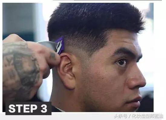STEP 2: 在耳上约2cm处,画出一水平分界线,并使用电梯刀把水平分界线下的头发剃掉(微信号:男生发型设计搭配衣服)。