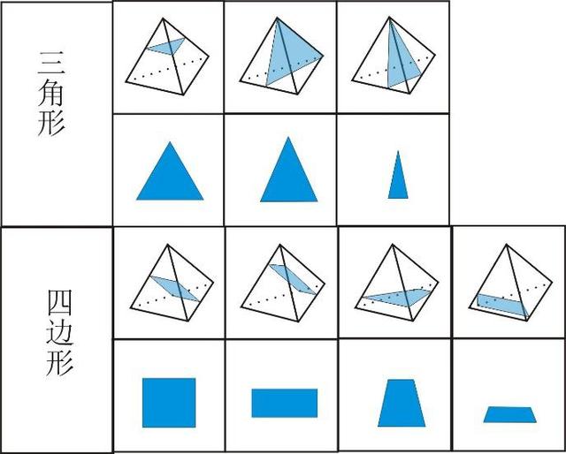 今天,我们就分析一下棱锥,先来看一下三棱锥也就是四面体。三棱锥一共有四个面,每个面都是一个三角形,那根据我们之前学习过的有几个面最多就能切出几边形 可知三棱锥可以切出三角形和四边形。要切出三角形,只要碰到三个面即可,那能不能切出特殊的三角形呢?当平行于一个面时,正三棱锥可以切出等边三角形;当平行于某一棱的时候,正三棱锥可以切出等腰三角形。同理,要切出四边形就要碰到四个面即可,特殊的四边形,如正方形则需要切面遇到的都是棱的中点;矩形则需要切面平行于两条棱;梯形只需要切面平行于一条棱即可。