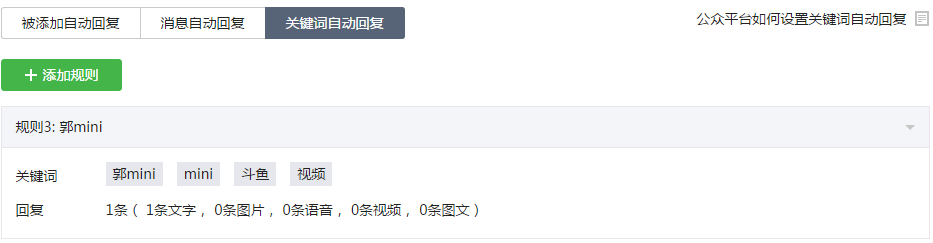 上述的关键词全部加上去,链接地址安排的合理,最好加上配图。并且微博加上并非官方类的话术,所以直播间的人大多数都会相信这类的链接。当用户直接打开这类链接后,会发现是一篇新闻类的链接,大多数的用户可能不会相信,但是要怎么转化到微信公众账号呢。 看到这些内容链接进入你网站链接的那绝对不会是看新闻的,如果你给他们看新闻,毫无疑问他们马上关掉你的链接,跳出网站,那么解决的办法来了。 转化到微信公众号 首先打开你的微信公众号,然后在自动回复中设置根据关键词自动回复,比如用户回复“mini”,然后你自动回复链接给用户,当然关键词最好设置多一些,因为有些用户即使你教他回复什么,他的回复的可能会不一致,所以他可能得不到链接。