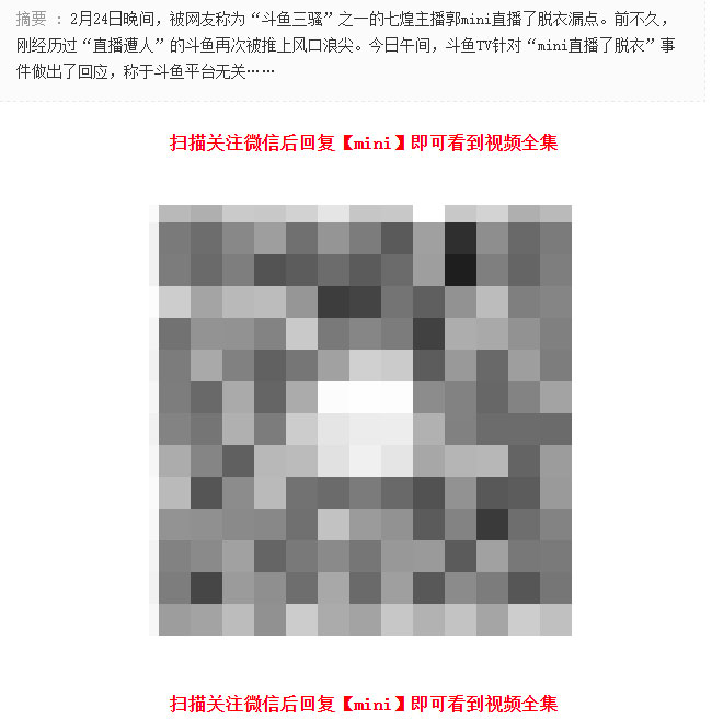 24日晚上斗鱼直播间出大事了,相信大家都看过了关于郭mini直播间换衣服的视频,太多人看到对我说的第一句话是“怎么穿着是C脱了是A”好吧,在这个新闻发出来之前,我是不认识郭mini的,所以他是A还是C我不关注,但视乎这条新闻可以给我带来些IP和微信粉丝。