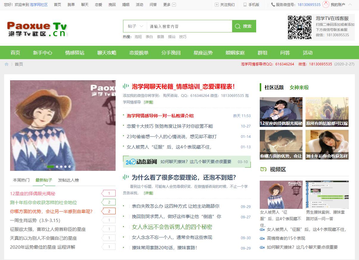 网站叫做泡学网,也叫作泡学网社区,网址是www.paoxuetv.com。进入网站第一眼看到的页面就是网站的聚焦板块。这个板块的大部分内容都是一些“专家级别”的恋爱大师分享的恋爱经验,从男女对话到平日里的一些小事都会有指导。你在这里学到的知识是你从小到大从来没有人教给你的知识,这也是为什么单身人士那么多的原因。在社区板块有着更加垂直的分类,男士情感、女士情感、星座、爱好等各种分类,你对哪个分类感兴趣就可以去对应的小社区交流学习,或者发表你的意见。