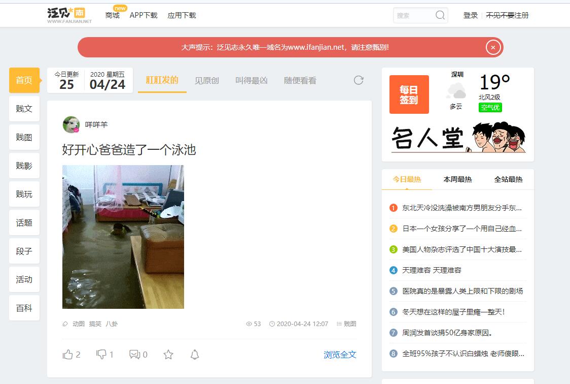 “泛见志”(www.fanjian.net)是以“娱乐、社会、奇闻、搞笑”等相关轻松、休闲内容为主,集萃大众关注的热点,是融合了资讯、图片、视频等多种形式的综合娱乐网站