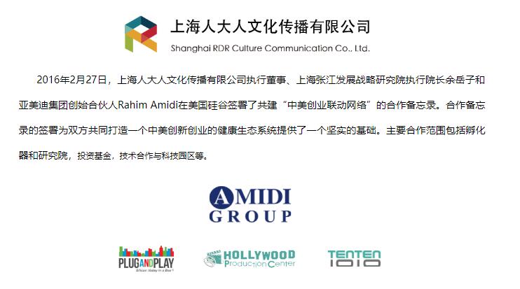 2016年底,由上海人大人文化传播有限公司主导的“中美影视文化与科技融合联动创新平台”获批上海市重大专项。平台的成立是在[电影产业促进法]的颁布实施,上海市提出创建金融,科技和文化中心这一目标的大前提下诞生,人大人文化传播希望能够通过这一平台,通过“三个一”和“三个一百”的努力,加速上海影视文化产业融合、加强国际交流合作,以科技驱动上海影视文化产业复兴、建立产业金融体系支撑可持续发展,进而推动上海影视文化产业升级,赢得上海影视文化产业发展的战略主动,助推长三角乃至全国影视文化产业一体化发展。 2016年2月27日,上海人大人文化传播有限公司执行董事、上海张江发展战略研究院执行院长余岳子和亚美迪集团创始合伙人Rahim Amidi在美国硅谷签署了共建“中美创业联动网络”的合作备忘录。合作备忘录的签署为双方共同打造一个中美创新创业的健康生态系统提供了一个坚实的基础。主要合作范围包括孵化器和研究院,投资基金,技术合作与科技园区等。 企业名称:上海人大人文化传播有限公司 组织机构代码:32468945-7 信用代码:91310115324689457P 注册号:310115002507711 注册资本:10000万元人民币 类型:有限责任公司(自然人投资或控股) 登记机关:自由贸易试验区市场监管局 法人:余岳子 成立日期:2014-12-02 状态:存续(在营、开业、在册) 地址:中国(上海)自由贸易试验区金藏路258号4号楼505单元 营业范围:文化艺术交流活动策划,各类广告的设计、制作、代理、发布,计算机图文设计、制作,多媒体数字影视技术、计算机网络信息领域内的技术开发、技术咨询、技术服务、技术转让,动漫设计,软件的开发、制作,企业管理服务,企业形象策划,市场营销策划,创意服务,商务信息咨询服务,会务服务,展览展示服务,礼仪服务,摄影服务,自有设备租赁。【依法须经批准的项目,经相关部门批准后方可开展经营活动】 参保人数:4 网址:http://www.rdrhcc.cn 主要人员:余岳子、余慧子 股东信息:(余慧子) 持股比例:(45.00%) 出资金额(4500)万元、(余岳子) 持股比例:(45.00%) 出资金额(4500)万元、(上海人大人投资管理有限公司) 持股比例:(10.00%) 出资金额(1000)万元 |