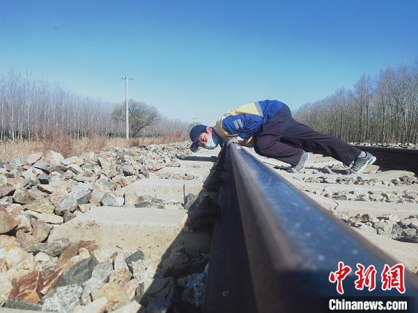 图为养路工人在作业中。 赵文龙 摄 中新网哈尔滨5月10日电 题:“淘金路”上的养路人:护送列车平稳抵达目的地 赵文龙 中新网记者 史轶夫 左腿单膝弯曲,右腿蹬直,两手抓住钢轨,胸部紧贴轨面,一双炯炯有神的目光沿钢轨向远处望去,“再往前三根枕,高低9毫米……”在黑龙江省双龙山站至建三江站区间的165公里铁路线上,梁天智带领职工正在进行线路维修作业,确保旅客列车安全平稳运行。 自5月5日开始,黑龙江省迎来一年一度的插秧客流,来自绥化市周边市县的插秧旅客乘坐“插秧专列”,奔赴三江平原进行春播生产,不仅满足了我国最大的商品粮基地春播生产的用工需求,也开启了本季“淘金路”。 今年51岁的梁天智,是中国铁路哈尔滨局集团有限公司佳木斯工务段前进镇线路车间建三江线路工区工长,有着30余年的工作经验,跟这条铁路打了半辈子交道,线路两侧保护区的情况、防护栅栏的状态、线路设备质量都了如指掌。