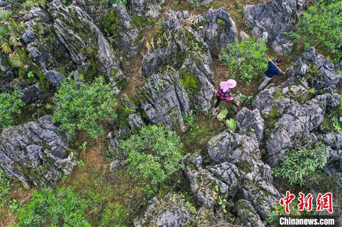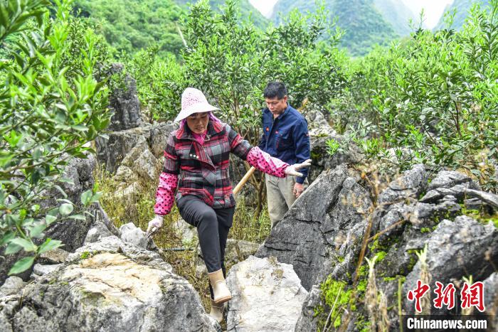 果园里石头众多。 王以照 摄 中新网柳州4月27日电 (王以照)黄美鲜是广西柳州市融安县一位种植金桔的果农,2015年,45岁的她放弃城市的工作,拿着半生攒下的50万积蓄回到老家融安县沙子乡,在石头缝开荒近200亩当上了“地主”,并在其中的60亩土地种上金桔,挂果第二年就收入120万元,成功收回之前投入的成本。