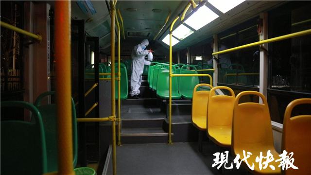 3月18日晚上8点,穿好防护服的陈强开始对405路公交车进行全方位消毒,车身、扶手、座位,任何一个角落都不放过。