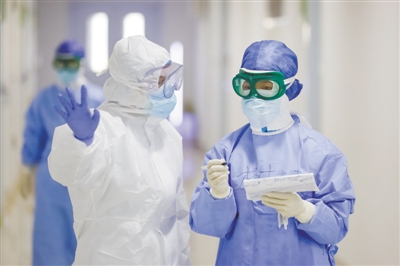 3月18日,浙江省第五批支援湖北医疗队正式接管武汉市金银潭医院的一个病区。图为金银潭医院护士与浙江省人民医院护士杨捷静(右)交接工作。新华社记者 沈伯韩摄