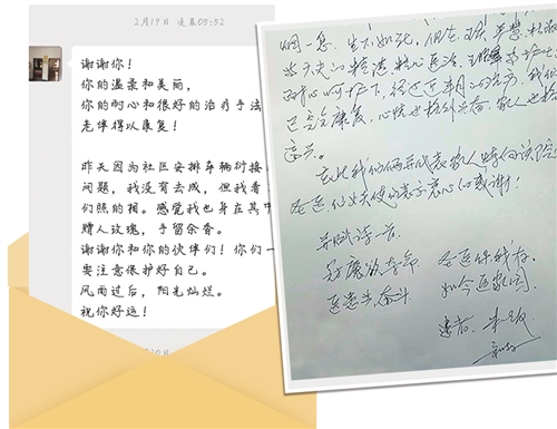 (图为王昭军负责的病人出院后通过微信或信笺给她发来的感谢信。) 28床梅建楚爹爹: 没事就为我拍照片 28床的梅建楚爹爹,只要没事就跟在我后面拍照片、拍视频。有一次我给一个婆婆喂饭,他搬个小凳子坐在边上拍。他们说自己是我的专属摄影师,还经常一块讨论:这样拍不好,那样拍好看!有一回,有个病人出院想给我拍照片。防护服上不是写着名字吗,因为衣服皱着名字看不太清楚,这个爹爹就站在边上帮忙拉着防护服好让别人把名字拍清楚。我每天上完班,都会收到好多照片,好幸福啊! 有时候感觉上班不像上班,就像和朋友在一起。他们经常会说“昭军啊,你休息一下!”“昭军谢谢你啊!”“昭军,你有没有吃东西啊?有什么我能帮你的吗?”我给大家发饭的时候,一次提得比较多,他们会跑来帮我分发。打针的时候,因为戴着手套有时候不太灵活,他们会帮着把敷料撕开。有时候忙不过来,他们还帮我看着别的病人。如果有机会的话,好想带你们去看一下我那些可爱的病人们。感觉病人像亲人一样,互相给予温暖。我对他们说,也是对自己说,一定要亲手一个一个地把他们健健康康地送出院。 我们医院是新冠肺炎定点医院,收治的都是病情比较重的病人。现在还能想起刚开始回来上班的时候,曾经也觉得恐慌。我记得是农历腊月三十,刚回到老家黄梅就听说武汉封城了。我就很着急,过两天我排了班,封城了我怎么上班?这时候肯定是要人的呀。我就赶快打电话,问了一圈也没人说得清楚。心里想着时间越拖肯定越难回去,就想马上出发。家里人不想让我走,我婆婆当时就哭了。但是想着我这个职业,也是没有办法的事。后来,我老公开车送我回的武汉。当时没想到这么严重,一回来就穿上防护服,开始是一层楼,后来整栋楼都收治了发热病人。 开始那段时间挺难受的,不是没经历过生死,但是眼看一个一个病人明明挺好的,可以吃饭、可以睡觉,突然一天不行了。那种无能为力的感觉,很难受。 我一直很想跟我的病人说,虽然我是给你们做护理的,但其实我的心理也是脆弱的。我觉得你们不应该谢我,我要谢谢你们。你们关心我,不断地给我力量;你们出院了,给了我战胜病毒的信心!我们是一样的,我们一起努力来打赢这场战斗! 24床管七香婆婆: 看到她就有信心 24床的管七香婆婆,来的时候血氧只有80多,还有乳腺癌、高血压。她住了31天院,我就看着她一点一点慢慢地好起来。真的就是看到希望!我用她的例子鼓励了很多人。每当有人消极的时候,我就会说:你看一下这位婆婆!她那么大年纪了,还有那么多基础疾病,她都挺过来了。所以只要有信心,肯定都能行!我跟他们说:我管的那么多病人,没有一个死亡的,大家最后一定都会出院的。 管七香婆婆不会写字,她让25床的婆婆给我写感谢信,我说真的不用写啊。看见你们出院了,我就特别高兴,觉得更有信心做好这份工作,觉得一切都值得!从来没有觉得自己的工作这么有意义! 与11位病人: 约好出院后一起合影 现在我最早管的11位病人已经全都出院了,我特别高兴。出院率高了,也没有刚开始那么危重的重症病人了,大家都觉得看到曙光了。我跟他们说:看到空床了没有?不像原来那样一床难求了!我们约定好了,等疫情结束了,一定要穿着自己的衣服,拍一张合影。因为他们总是说,都没有看到我长什么样子。27床的爹爹给我写的感谢信里还有一首诗:病魔欲夺命,圣医保我存。医患共奋斗,如今返家园。 我的病人是不是很可爱?是不是特别棒!? 我一直都喜欢自己的工作,我老公说我上班的时候状态和平常不一样。我们科室老病人很多,他们都认识我。以前的时候很多病人就愿意让我管,他们说我打针不疼、态度还好。那是因为上班要打起十二分的精神啊!病人们来的时候身体都是不舒服的,心情肯定也不好,你要把他们当病人,更耐心一些。而且我们多关心他们一点,气氛更好一点,他们也会更配合工作,病也能好得快一点。 有时候别人会问我,为什么你的病人满意度这么高?我说因为我碰到的都是好人,病人都很喜欢我呀!只要你保持一颗善良的心,每个人都可以很善良。上班哪能没有不开心的时候,我属于泪点比较低的人。过一段时间,可能会大哭一场,缓上一两天,感觉自己又可以轻松地、积极地去生活。活着肯定要努力,活着肯定很辛苦,但是不努力的话,就什么都没有了。 人嘛,保持一颗单纯的心,积极地去工作,也不用想那么多。尽自己最大的努力做面前的事情,去感受幸福、感受温暖。当你觉得温暖、觉得幸福的时候,你会更有信心去做事,也会越做越好。就像病人对我的肯定、关心,也会让我觉得工作很美好,大家都会越来越好。 我跟我老公说,再过几年,你出去的时候就可以骄傲地说,你老婆是英雄、是战士。以后我们家女儿长大了,遇到困难的时候,也可以激励自己:我妈妈是个英雄,我妈妈可以这么坚强!我想着,尽自己微薄的能力做好本职工作,也能给她做个好榜样! (经济日报-中国经济网记者 乔申颖 高兴贵整理) |