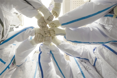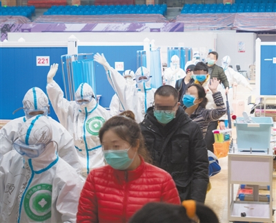 3月10日,武昌方舱医院最后一批痊愈病人共49人出舱。图为在武昌方舱医院,医护人员等待出舱时互相鼓劲。 新华社记者 费茂华摄