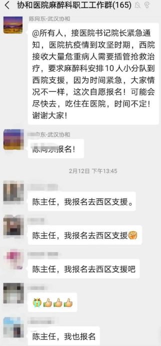 壹 集结号 “紧急通知!医院抗疫情到攻坚时期,西院接收大量危重病人需要插管抢救治疗,要求麻醉科安排10人小分队到西院支援。时间紧急,大家自愿报名”。这是2月12日上午陈向东在工作群里发出的医院紧急通知。 病毒猛烈的传播力,开放气道插管,每位麻醉医生都知道这意味着什么,陈向东更是心如明镜。本以为报名会有一定的响应时间,但令他意外的是不到20分钟,10人小分队就迅速集结完毕,协和西院“插管突击队”宣告成立。