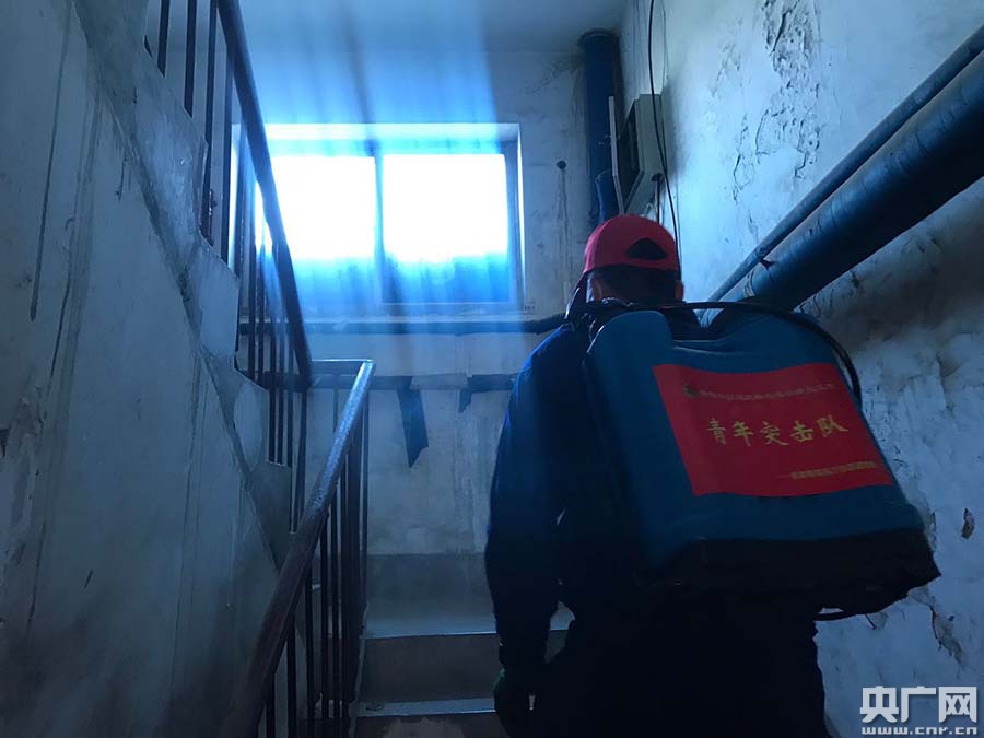 突击队员们每天早上八点半出发 背着50斤的药水箱 一层楼一层楼挨家挨户的消毒 爬的最高楼有九层 每天连续干到晚上五点