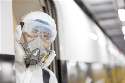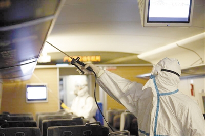 杨波与伙伴们在对列车进行消毒