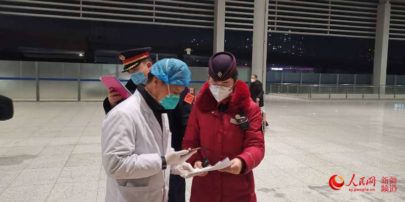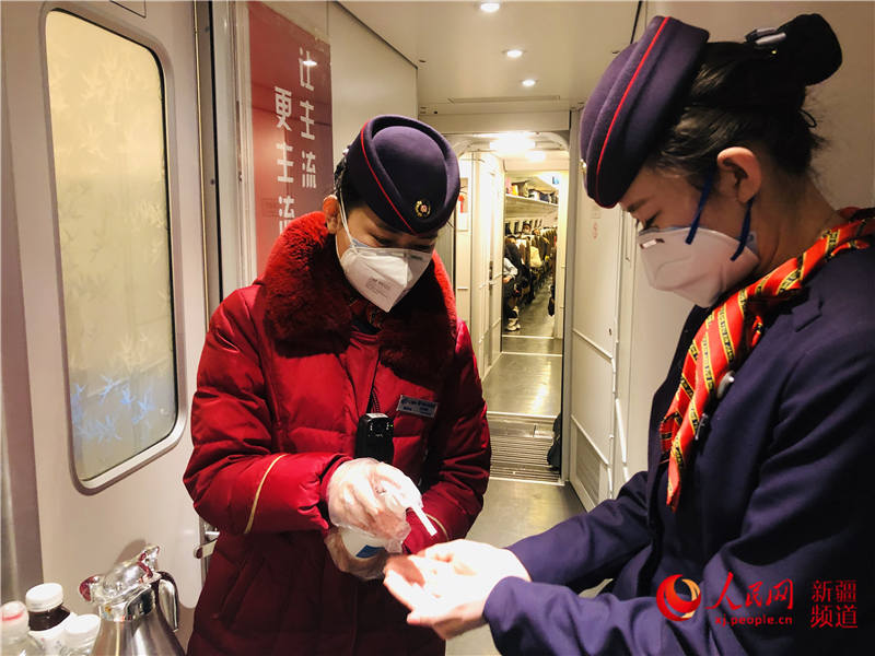 “D8805次列车各车厢乘务员,查验完车票和保洁员一起做好车厢的消毒工作,一定要确保无死角消毒。”列车长卢依莎提示。 “这是我担任列车长迎来的第一个春运,没想到就赶上了抗疫工作。”新车长面临新考验,卢依莎却忙而不乱。 列车从乌鲁木齐开车前,她和同事为旅客进行了测温。列车开车后,她将两支测温仪分发到列车员手中,为中途站上车旅客旅客进行测温。联系前方站,巡视车厢,组织消毒、测温,服务重点旅客……列车上,她一路巡视着,将一切处理的井井有条。 女儿走上新的岗位,也牵动着父母的心。 “车上人多,你要注意防护。”接到家人打来的电话,卢依莎说:“放心吧,我们的防护很到位。” 暖心的“姐姐”