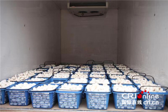 老伴汪学超正在喂鸡。闾陈雨 摄 正说着,有人走了进来,原来是来收蘑菇的。 “我们不愁卖,因为有森肽公司来按价格收走蘑菇,企业会带动我们。如果市场价低了,他们也是包底给我们;如果涨了,他们也可以随时给我们涨一点点。” 姚素琼笑眯眯地看着这一筐筐小蘑菇,这些小蘑菇一个季度一卖,就至少会有6万元的收入。 而双胞菇每个季度产量可以达到七到十吨,一年的产量在三十到四十吨左右。 但是,记者在采访中发现,种蘑菇极其辛苦:凌晨两三点就得起床上山摘蘑菇,浇水、扫地、消毒,下午三四点再摘一次,再浇水、扫地、消毒,一天在棚里起码工作十个小时,日复一日。但是姚素琼每天都干得非常开心。“真的是虽然辛苦,但是我们只要赚得到钱,我们不怕。说白了我们一分钱赚不到也有10万块钱,我以前打工都没赚到那么多钱。”