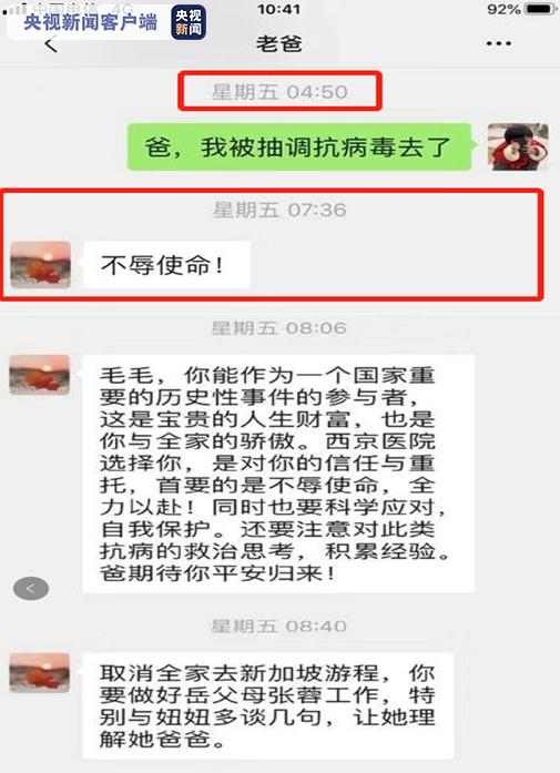 大年除夕凌晨4点50分,空军军医大学西京医院神经外科副主任医师胡世颉给父亲发了一条微信:“爸,我被抽调抗病毒去了。”7点36分,老父亲回复四个字:“不辱使命!”虽然知道家人一直支持自己的工作,但临时取消期盼已久的全家旅游计划得到年迈双亲的理解,正在收拾行李的胡世颉还是松了一口气。