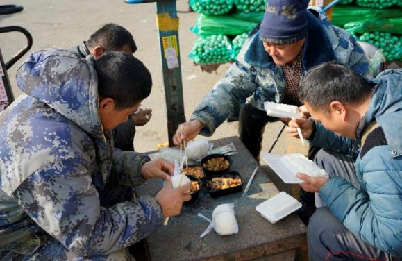 秦健容和合伙人一起吃午饭。 一百多辆装满芹菜的货车排了两列,在一天24小时中,这些商贩做的最多的事情就是等待。北京冬日午后的阳光给了秦健容发呆的权利,不忙的时候,他会坐在带来的椅子上,整理一下自己的思绪,或者干脆什么都不想,独自晒晒太阳。来北京的这十几年,他的生活像是被复制粘贴了,每一天都和前一天没有区别。印象最深的一件事?他一时半会还真想不起来。