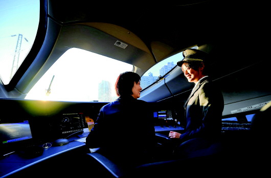 1月8日,金婉鑫(右)与同事肖梨花在停靠在福州北动车组停车所的G1609福州到广州南的动车上交流工作心得。 本报记者林善传摄