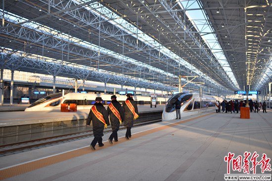 12月30日,北京至张家口高速铁路开通运营,京张高铁设计时速350公里,全线设北京北、清河、沙河(不办理客运)、昌平、八达岭长城、东花园北、怀来、下花园北、宣化北、张家口10座车站。京张高铁是我国首条智能化高速铁路,也是2022年冬奥会的“门户工程”。北京北站站台,三名站务人员走向一辆即将发车的京张高铁列车。 实习生 宋欣然/摄