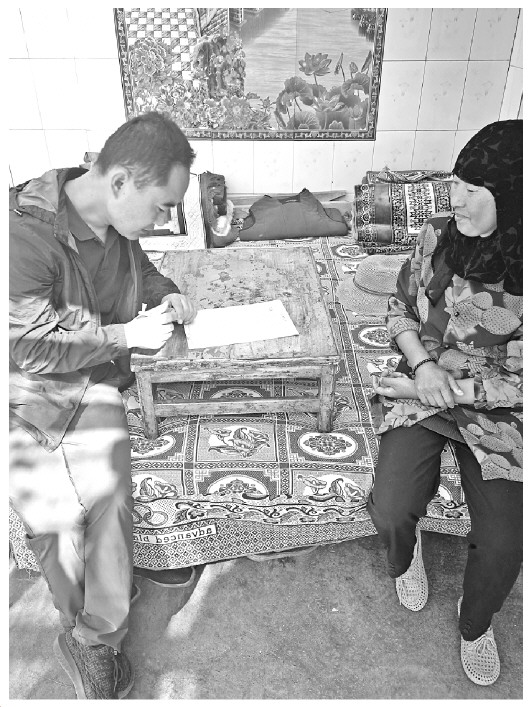 ▲ 彭栋清正在村民马富贵家中向其讲解2019年脱贫攻坚到户政策。