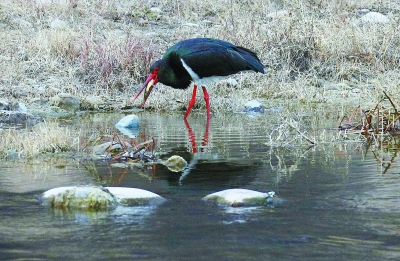 拒马河湿地,一只珍贵的黑鹳捕捉到一条嘎鱼正在享用。