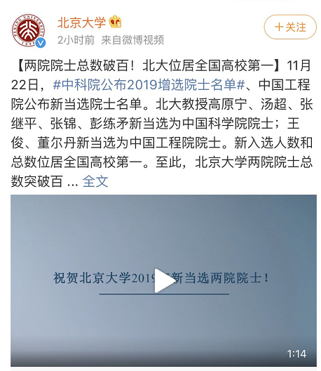 本次,北京大学7人入选,入选人数为全国高校第一。至此,北京大学现有中国科学院院士83人,中国工程院院士18人。 北京大学院士学部分布情况如下:中科院院士主要集中在数学物理学部,其次是地学部,人数最少的是技术科学部。工程院院士主要集中在医药卫生学部,其次分别是信息与电子工程学部和环境与轻纺工程学部。 同学们,知道大学志愿怎么报了吧? 3.最“草根”的院士:两名民企科技专家 在中国工程院院士增选院士名单中,阿里巴巴技术委员会主席王坚、芯创智(北京)微电子有限公司董事长吴汉明成为来自民营企业唯二当选的新晋院士。 今年1月,在院士候选人推荐(提名)工作启动之初,中国科协办公厅发文明确鼓励从民营企业中推选院士,提出要“在推选中国工程院院士候选人中,要特别关注在企业特别是基层和民营企业技术创新中作出重大成就和贡献的工程科技专家”。王坚、吴汉明的当选,正是在这一背景下诞生的结果。 英雄不问出处,他们的当选象征国家科技创新体系启动“民企引擎”。 4.“最美”的院士