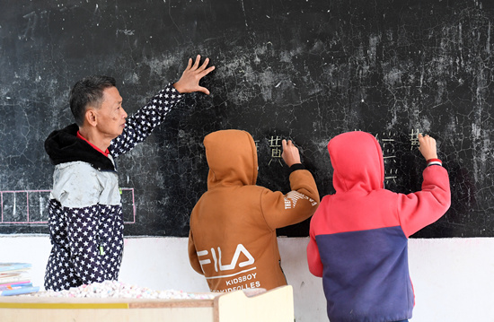 11月19日,梁志雄教两名学生写字。新华社记者 陆波岸/摄 一所学校,一名教师,三名残障学生……现年59岁的壮族老师梁志雄是广西上思县那琴乡中心小学逢通村教学点唯一的教师。三名学生,有一对是双胞胎,患有智力障碍,今年15岁;另一名学生患有语言障碍,今年11岁。他每周一到周五都住在学校里,给这三名学生上课。那名11岁的学生只有周末才能回家,梁志雄就住在学校里照顾他,除了上课,还要给他做饭,晚上和他同住一室。 明年7月,年满60岁的梁志雄将从讲台上退下来。“您退休了,如果没有老师来这里教这三个学生怎么办?”梁志雄说,“如果没有老师来,如果还需要我,我会继续坚守在这里。因为,我的残障学生不能没有陪伴。” |