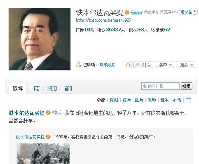腾讯政务微博再一次迎来重量级人物。昨天,原全国人大常委会副委员长铁木尔-达瓦买提(收听)在腾讯的微博正式对身份进行认证,成为政务微博中首位认证的中央领导级别的人物。(3月1日中国网)
