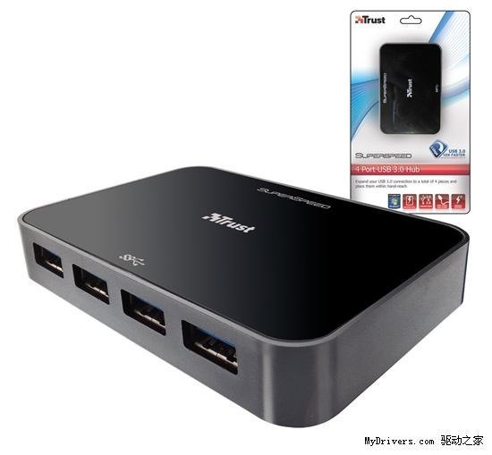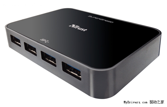 来自欧洲的知名外设品牌楚斯特(TRUST)今天也推出了一款四口USB 3.0 Hub。 该产品被直白地叫作“SuperSpeed 4 Port USB 3.0 Hub”,银黑色方盒子造型,尺寸230×140×70毫米,提供了一个上行USB 3.0和四个下行USB 3.0高速接口,理论最高速度可达5Gbps,并向下兼容USB 2.0/1.1,还附送USB 3.0数据线和电源适配器。 不过内部使用的控制芯片方案并未透露。 这款四口USB 3.0 Hub现已接受预订,标价45欧元,约合人民币420元。