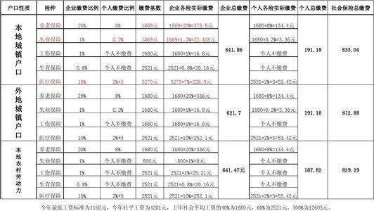 小雨手机用户的回答:本市城镇、外埠城镇和外埠农村劳动力的缴费比例是一样的,养老:企业20%,个人8%;失业:企业1%,个人0.2%;工伤:按照企业所属行业的行业费率算;生育(本市以及外埠城镇有北京市居住证的):企业0.8%;医疗:企业12%,个人2%+3。 扩展资料: 计算方法: (一)企业缴费额=核定的企业职工工资总额×20%;职工个人缴费额=核定缴费基数×8%(目前为8%)=职工个人工资总额×60%~300%×8%。 (二)个体劳动者(包括个体工商户和自由职业者)缴费额=核定缴费基数×18%。例如:2003年4月份河北省公布的2002年度省社平工资为每月747元。 因此缴费基数可以在747—2241元之间自主选择(即省社平工资每月747元的100%-300%之间选择缴费)。全年缴费金额最少为:747×18%×12=1613.5元,最多为:2241×18%×12=4840.6元。 缴费比例: 缴费比例分作以企业参保和以个体劳动者参保两类: (一)各类企业按职工缴费工资总额的20%缴费,职工按个人缴费基数的7%缴费(2003年为7%,两年提高一个百分点,最终到8%)。职工应缴部分由企业代扣代缴。 (二)个体劳动者包括个体工商户和自由职业者按缴费基数的18%缴费,全部由自己负担。 参考资料来源:百度百科-养老保险标准 |