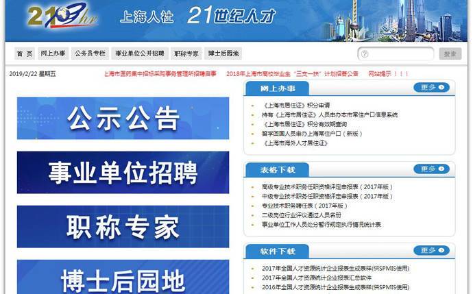 21世纪人才网(www.21cnhr.gov.cn)自2000年12月29日开通,由上海市人力资源和社会保障局主办,上海市21世纪人才网是为社会提供人事政务服务的大型专业门户网站,是上海市信息港配套工程的重要组成部分。
